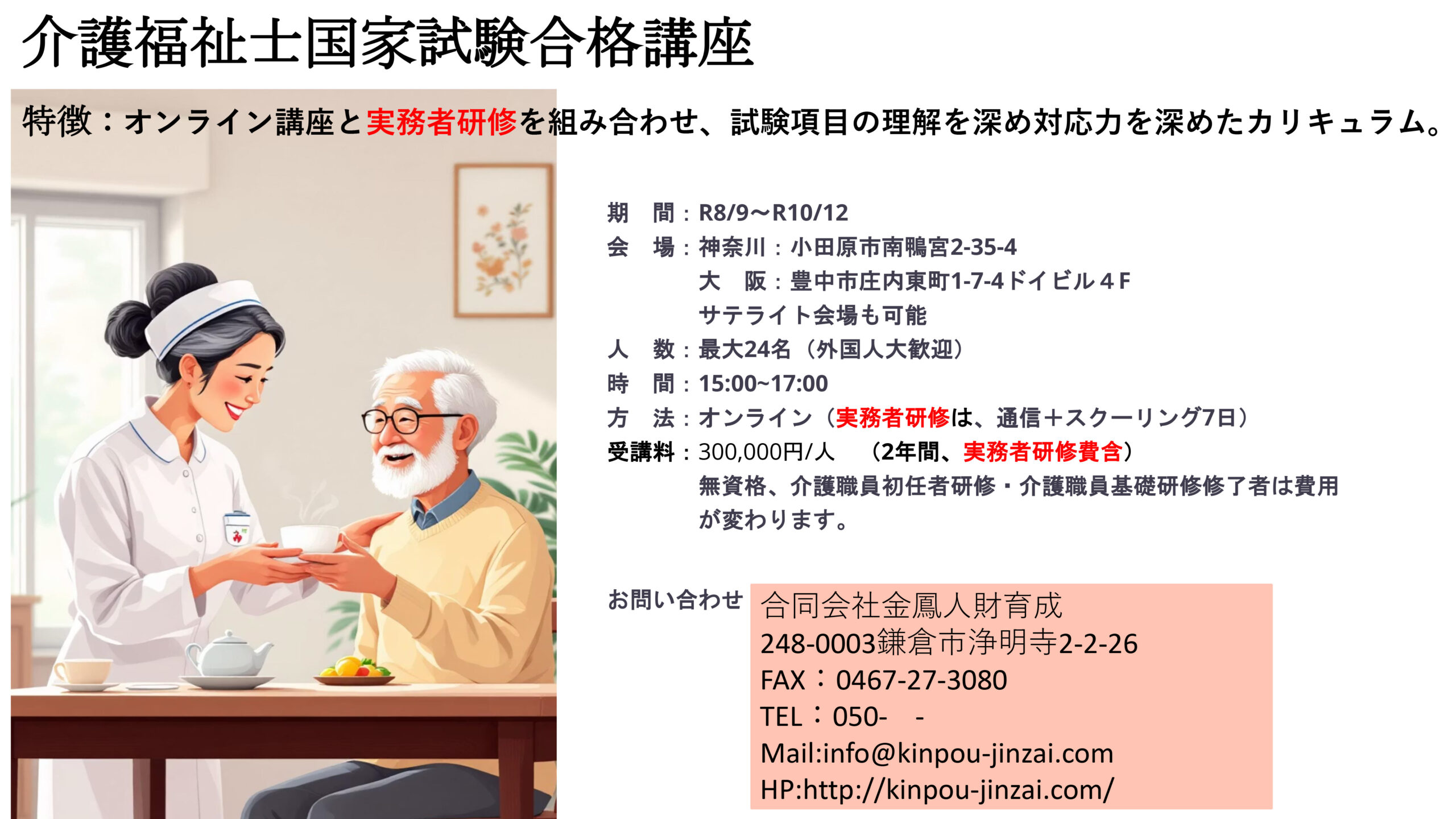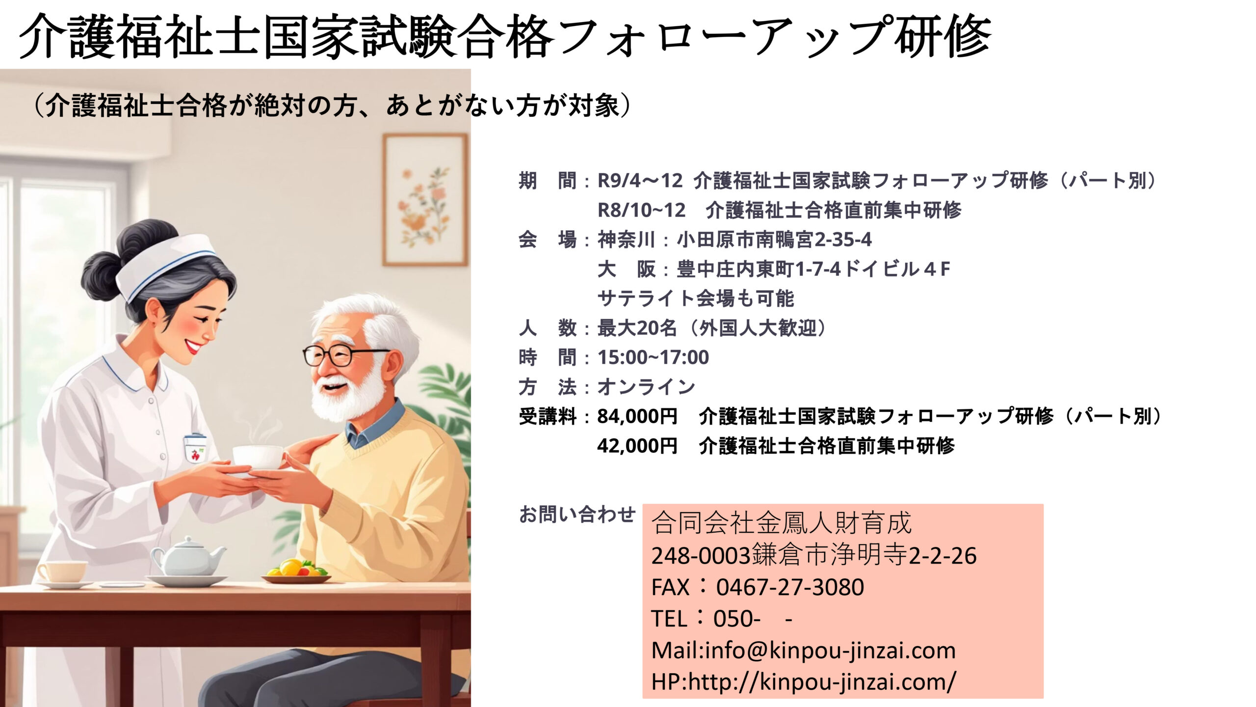 介護研修BLOG 2026.02.05 介護福祉士国家試験対策 2つの講座をご紹介 介護福祉士国家試験合格を目指す方向けに、目的に合わせて選べる 2つの講座をご紹介します。 1.介護福祉士国家試験合格講座 2.介護福祉士国家試験フォローアップ研修 お問い合わせはこちら ご縁 前の記事